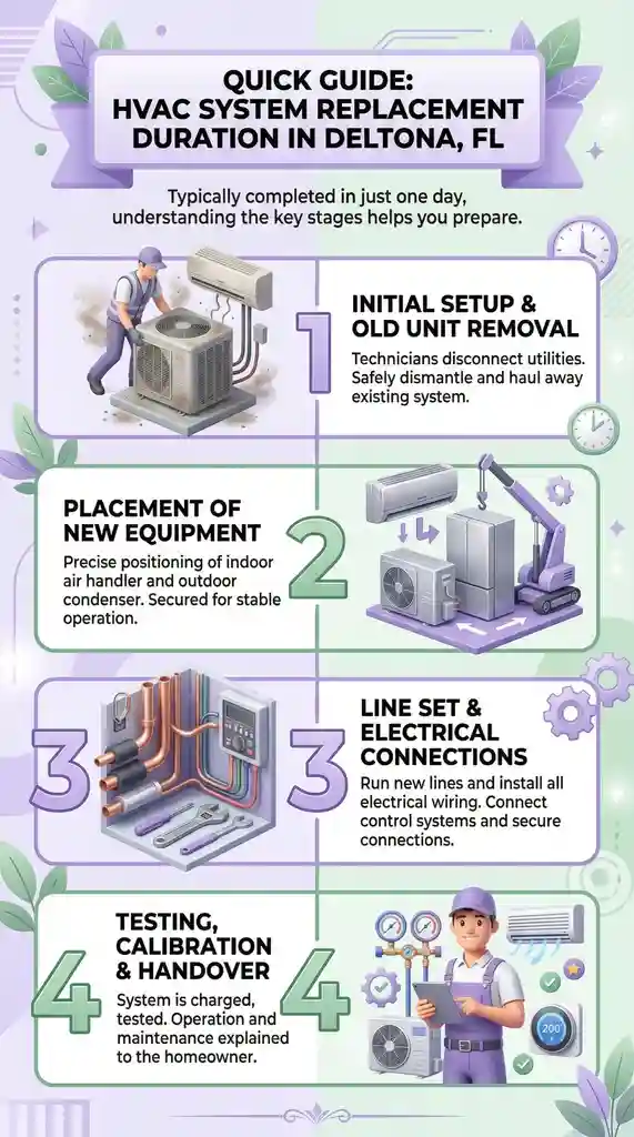 A job that includes all of these steps typically runs six to eight hours for a standard Deltona home during a proper HVAC replacement service. A job that skips several of them can be done in three.